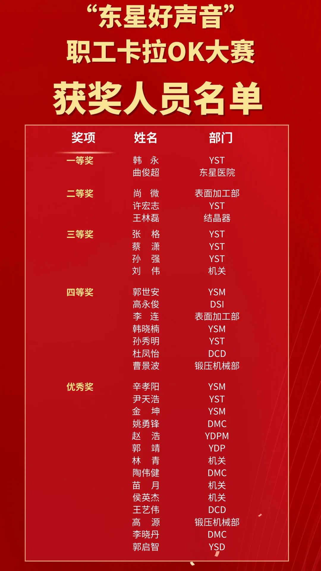 讓青春與熱情對話,讓歌聲與夢想放飛!為了打造健康文明、奮發(fā)昂揚的企業(yè)文化氛圍,豐富員工們的業(yè)余文化生活,深入挖掘集團公司優(yōu)秀藝術人才,展現東星職工的個人魅力與風采,8月27日下午14:30,伴隨著動感的音樂和燈光秀,“東星好聲音”職工卡拉OK大賽決賽在煙臺開發(fā)區(qū)萬行廣場盛世華堂宴會酒店激情開唱。集團公司副董事長、副總經理厲強,副總經理王建全,總經理助理宮明杰以及集團本部各單位和各長投單位的主管領導觀看了比賽。煙臺首鋼豐田工業(yè)空調壓縮機有限公司總經理渡邊靖也親臨比賽現場為選手們加油助威。 本次大賽歷時近一個月的時間,共有來自15個單位的57名選手參加了海選。8月12日,集團公司工會在機關二樓會議廳組織了預選賽,在預賽的30名選手中,評選出16名晉級決賽。為了體現公開、公平、公正的辦賽原則,決賽特邀了5位在國家級、省市級各項音樂賽事中獲獎的專業(yè)評委現場在線評分,同步上傳至大屏幕,使參賽選手和觀眾們能夠第一時間了解到每位選手的得分情況。 音樂沒有國界,它可以穿越時空,跨越年代。在比賽現場,選手們的演唱曲目豐富多彩,從90年代的《新不了情》《刀劍如夢》到如今的當紅流行歌曲《光年之外》《最美的太陽》;從唱出一名軍嫂內心故事的《妻子》到鼓舞人心、令人向上的英文歌曲《You Raise Me Up》;從獨唱到樂隊伴奏演唱……選手們的表演風格各異,精彩紛呈,不同時代的音樂就像時光穿梭機,帶領大家重溫經典,感受時代的變遷。 鍛壓機械部 曹景波 《感謝》 表面加工部 李連 《站在草原望北京》 結晶器 王林磊 《最美的太陽》 YSM 韓曉楠 《終于等到你》 YSM 郭世安 《海闊天空》 YST 張格 《新不了情》 表面加工部 尚微 《妻子》 YST 蔡瀟 《刀劍如夢》 DCD 杜鳳怡 《恰似你的溫柔》 YST 孫秀明 《故鄉(xiāng)》 YST 許宏志 《領悟》 機關 劉偉 《YOU RAISE ME UP》 DSI 高永俊 《我是真的愛上你》 東星醫(yī)院 曲俊超 《千百年后誰還記得誰》 YST 孫強 《光年之外》 YST 韓永 《天邊》 最終,來自YST的韓永和東星醫(yī)院的曲俊超獲一等獎;尚微、許宏志、王林磊獲二等獎;張格、蔡瀟、孫強、劉偉獲三等獎;郭世安等7名選手獲四等獎;晉級預賽的辛孝陽等14名選手獲優(yōu)秀獎。出席活動的領導給獲獎選手們頒獎并合影留念。