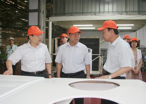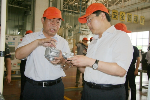 在YSD車用空調(diào)生產(chǎn)現(xiàn)場,王市長聽取了東星集團(tuán)董事長、總經(jīng)理杜寶棟關(guān)于企業(yè)發(fā)展情況和車