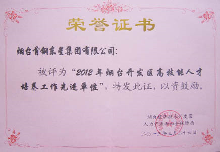 在近日召開(kāi)的開(kāi)發(fā)區(qū)勞資會(huì)議上,煙臺(tái)東星集團(tuán)有限公司獲評(píng)煙臺(tái)經(jīng)濟(jì)技術(shù)開(kāi)發(fā)區(qū)人力資源和社會(huì)保障局“2012年煙臺(tái)開(kāi)發(fā)區(qū)高技能人才培養(yǎng)工作先進(jìn)單位”榮譽(yù)稱號(hào)。