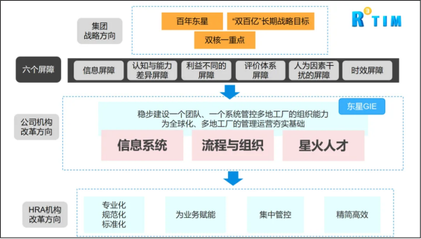 2022年以來,東星集團(tuán)以“雙百工程”為目標(biāo),以“雙核一重點(diǎn)”戰(zhàn)略為指引,全面推進(jìn)R3TIM六項系統(tǒng)工作,業(yè)務(wù)發(fā)展穩(wěn)步由“供應(yīng)全球”向“全球供應(yīng)”轉(zhuǎn)型。通過戰(zhàn)略、流程與組織、信息系統(tǒng)及東星星火人才四個層面的深化改革,逐步打破信息壁壘、時效低、認(rèn)知與能力差異、利益不同、評價體系不同、人為因素干擾等帶來的六個影響組織效率的屏障,鑄造敏捷前臺、強(qiáng)系統(tǒng)強(qiáng)中臺、精簡集成共享的強(qiáng)支持后臺的核心競爭力,實現(xiàn)一個系統(tǒng)、一個團(tuán)隊管控多地工廠,建設(shè)“全球集成管理式企業(yè)”-東星GIE。隨著機(jī)構(gòu)改革持續(xù)深入推進(jìn),目前已完成前臺組織CTS\DRDC\DAMT和強(qiáng)中臺組織CSCL\iSIM的搭建,多地子公司投入運(yùn)行,公司對行政、人力資源等后臺部門的價值和效能提出了新的管理需求,后臺機(jī)構(gòu)改革勢在必行。